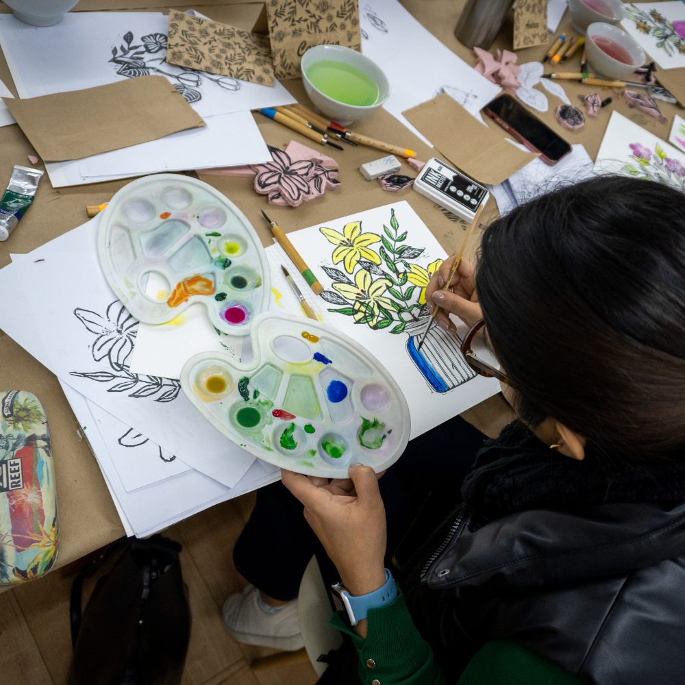 En este taller abordaremos técnicas mixtas como la acuarela, el grabado y el recorte (collage) para experimentar de manera libre con ellas y crear una composición propia cargada de emociones.